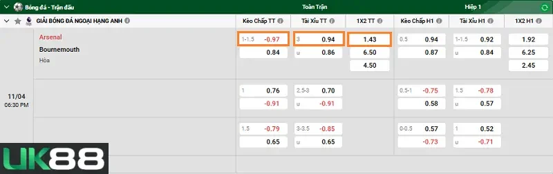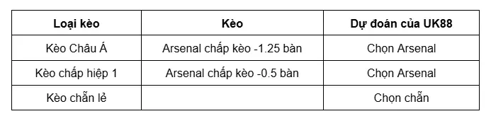 Kèo chấp của nhà cái UK88 đã đưa ra là chủ nhà Arsenal chấp kèo đội khách Bournemouth trong khoảng từ -0.5 đến -2.0 bàn. Ở kèo chấp trải dài nếu cửa trên muốn ăn kèo Châu Á thì Arsenal phải đánh bại được Bournemouth với tỷ số cách biệt ít nhất từ 1 đến 2 bàn. Arsenal có thể thực hiện được khi hưởng lợi thế sân nhà Emirates Stadium cùng đẳng cấp chơi bóng vượt trội. Cộng với đó, Arsenal có sở hữu dàn cầu thủ đầy đẳng cấp hàng đầu giải đấu với những Rice, Saka hay Gyokeres. Do đó, người chơi nên lựa chọn cửa chủ nhà Arsenal chấp kèo là khá an toàn.