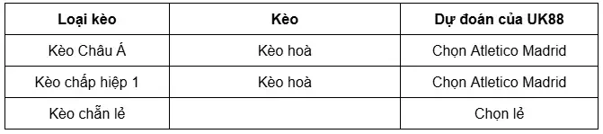 Tỷ lệ kèo châu Á: Atletico Madrid có kèo hoà với Arsenal. Lựa chọn: Atletico Madrid. Dự đoán tỉ số chung cuộc: Atletico Madrid 1-0 Arsenal.
