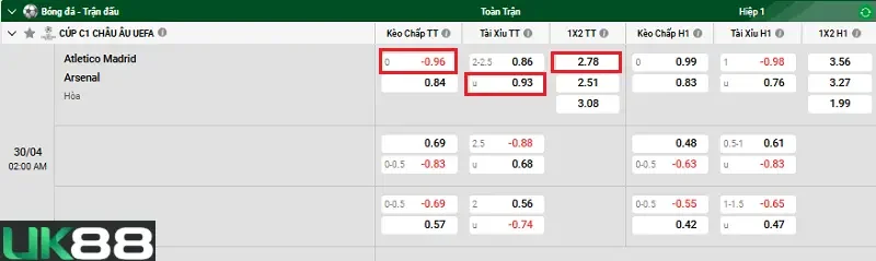Trận đối đầu giữa Atletico Madrid vs Arsenal sẽ diễn ra tại sân vận động Metropolitan Stadium tại thủ đô Madrid của đất nước Tây Ban Nha. Atletico Madrid sẽ tiếp đón Arsenal trong khuôn khổ trận lượt đi của vòng đấu bán kết tại giải đấu UEFA Champions League mùa giải 2025-2026. Atletico Madrid dù có lợi thế thi đấu trên sân nhà so với Arsenal, nhưng chỉ được đánh giá kèo hoà. Nhà cái UK88 ra kèo đấu Atletico Madrid có kèo hoà đối với đội khách Arsenal và mỗi đội có kèo chấp -0.25 bàn.