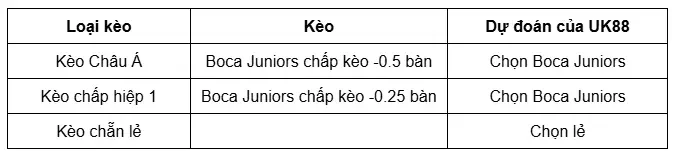 Tỷ lệ kèo hiệp 1: Boca Juniors chấp kèo -0.5 bàn. Lựa chọn: Boca Juniors.