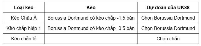 Tỷ lệ kèo hiệp 1: Borussia Dortmund có kèo chấp -0.5 bàn. Lựa chọn: Borussia Dortmund.