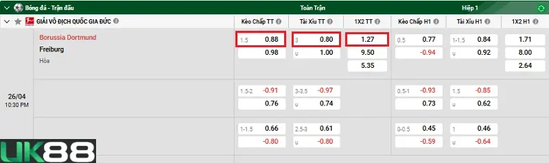 Kèo chấp của nhà cái UK88 đã đưa ra là chủ nhà Borussia Dortmund sẽ có kèo chấp đối với đội khách Freiburg trong khoảng từ -1.25 đến -1.75 bàn. Nhìn vào kèo chấp này, thì Borussia Dortmund sẽ cần phải đánh bại được Freiburg với cách biệt ít nhất 2 bàn để ăn kèo Châu Á. Borussia Dortmund sẽ khó có được chiến thắng quá cách biệt khi Freiburg ở mùa giải năm nay thi đấu khá tốt. Tuy nhiên, Borussia Dortmund có lợi thế sân nhà Signal Iduna Park cùng hàng vạn cổ động viên tiếp thêm sức mạnh. Do đó, người chơi có thể tin tưởng và đặt cược vào cửa Borussia Dortmund chấp kèo trước Freiburg.