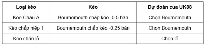 Tỷ lệ kèo hiệp 1: Bournemouth chấp kèo -0.25 bàn. Lựa chọn: Bournemouth.