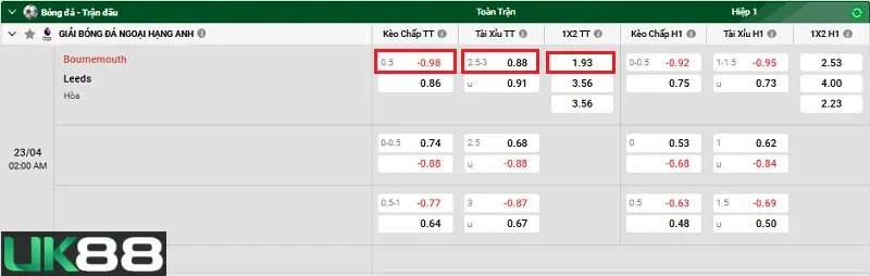 Kèo nhà cái Bournemouth vs Leeds hôm nay, 02h00 ngày 23/4/2026 (UK88)