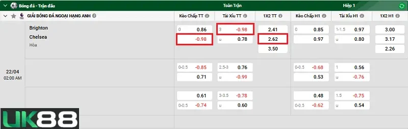 Kèo nhà cái Brighton vs Chelsea hôm nay, 02h00 ngày 22/4/2026 (UK88)
