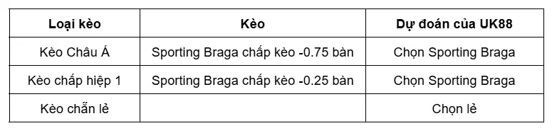 Tỷ lệ kèo hiệp 1: Sporting Braga chấp kèo -0.25 bàn. Lựa chọn: Sporting Braga.