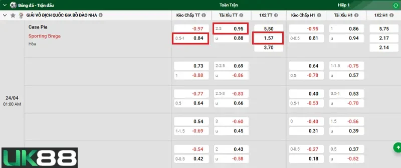 Nhìn qua tỷ lệ kèo mà nhà cái UK88 đã đưa ra, có thể nhận định được rằng tỷ lệ thắng của Sporting Braga có tỷ lệ cao hơn so với chủ nhà Casa Pia. Đây là kèo đấu khá dễ lựa chọn khi cửa thắng của Sporting Braga cao hơn rất nhiều so với của Casa Pia. Mặc dù Casa Pia được hưởng lợi thế chơi bóng trên sân nhà Estádio Municipal de Rio Maior nên Sporting Braga sẽ gặp đôi chút khó khăn. Tuy nhiên thứ hạng của hai đội bóng trên bảng xếp hạng của Primeira Liga đã thể hiện sự chênh lệch. Sporting Braga có đẳng cấp chơi bóng cao hơn cùng dàn cầu thủ đạt phong độ tốt. Do đó, chiến thắng ở cửa Sporting Braga đang khá là cao và an toàn dành cho người chơi.