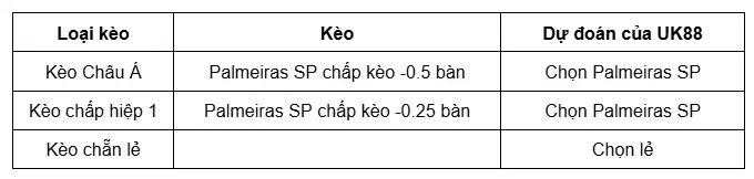 Tỷ lệ kèo hiệp 1: Palmeiras SP chấp kèo -0.25 bàn. Lựa chọn: Palmeiras SP.