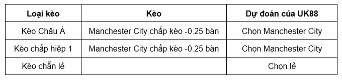 Tỷ lệ kèo châu Á: Manchester City chấp kèo -0.25 bàn. Lựa chọn: Manchester City. Dự đoán tỉ số chung cuộc: Chelsea 1-2 Manchester City.