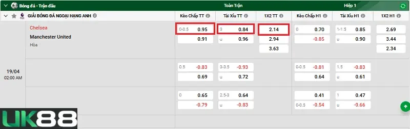 Kèo chấp của nhà cái UK88 đã đưa ra là chủ nhà Chelsea sẽ có kèo chấp đối với đội khách Manchester United trong khoảng từ -0.25 đến -0.50 bàn. Với kèo chấp đã có, Chelsea cần phải đánh bại được Manchester United với cách biệt ít nhất 1 bàn để ăn kèo Châu Á. Chelsea tỏ ra tự tin trước Manchester United khi được hưởng lợi thế thi đấu trên sân nhà Stamford Bridge cùng với sự tiếp sức từ các cổ động viên nhà. Cộng với đó, Chelsea đang có kết quả toàn thắng khi tiếp đón Manchester United trên sân nhà ở 2 trận gần nhất tại giải đấu Ngoại hạng Anh. Do đó, người chơi nên cân nhắc lựa chọn cửa chấp kèo của Chelsea.