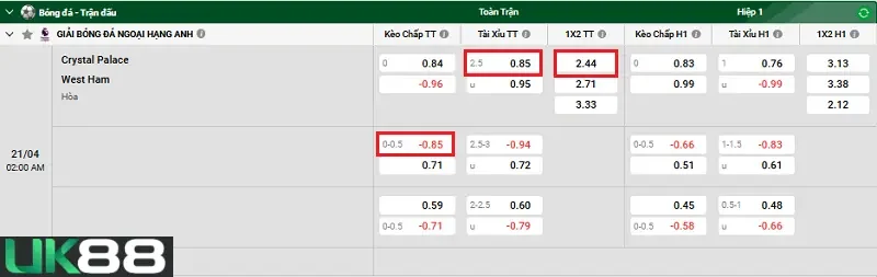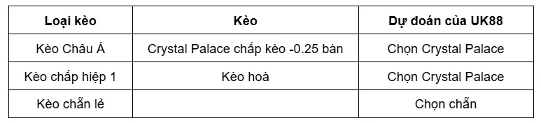 Kèo chấp của nhà cái UK88 đã đưa ra là chủ nhà Crystal Palace sẽ có kèo chấp đối với đội khách West Ham trong khoảng từ -0.25 đến -0.5 bàn. Với kèo chấp đã có, đội cửa trên là Crystal Palace sẽ phải giành lấy được ít nhất là chiến thắng trước West Ham nếu muốn ăn kèo Châu Á. Crystal Palace tỏ ra rất tự tin khi được thi đấu trên sân nhà Selhurst Park trước sự tiếp sức của hàng vạn người hâm mộ. Bên cạnh đó, Crystal Palace có thành tích đối đầu tốt trước West Ham khi hai lần tiếp đón gần nhất đều có được chiến thắng. Do đó, người chơi nên cân nhắc lựa chọn cửa thắng cho Crystal Palace.