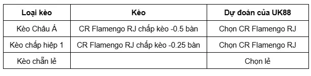 Tỷ lệ kèo hiệp 1: CR Flamengo RJ chấp kèo -0.25 bàn. Lựa chọn: CR Flamengo RJ.