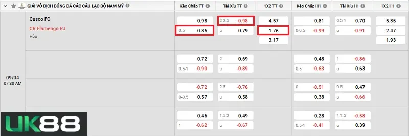 Kèo chấp của nhà cái UK88 đã đưa ra là chủ nhà Cusco FC sẽ được hưởng kèo chấp bởi đội khách CR Flamengo RJ trong khoảng từ -0.25 đến -1.25 bàn. Dù Cusco FC được chơi trên sân nhà Estadio Garcilaso nhưng lại có trình độ chơi bóng thấp hơn so với CR Flamengo RJ. CR Flamengo RJ với tư cách là đội cửa trên sẽ cần phải có được chiến thắng với cách biệt từ 1 đến 2 bàn trước Cusco FC để ăn được kèo Châu Á. Sự tự tin đến từ phong độ thi đấu khiến cho đội khách CR Flamengo RJ được các chuyên gia của UK88 tin tưởng. Do đó, người chơi nên lựa chọn CR Flamengo RJ chấp kèo đối với chủ nhà Cusco FC.