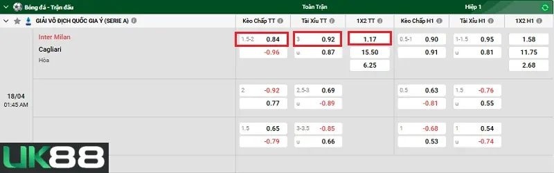 Kèo chấp của nhà cái UK88 đã đưa ra là chủ nhà Inter Milan sẽ có kèo chấp đối với đội khách Cagliari trong khoảng từ -1.5 đến -2.0 bàn. Với kèo chấp mà nhà cái UK88 đặt ra thì Inter Milan sẽ là đội cửa trên và cần phải có được ít nhất một chiến thắng trước Cagliari với khoảng cách 2 bàn để thắng mọi kèo Châu Á. Theo dự đoán thì dù Inter Milan đang phong độ tốt cùng đẳng cấp vượt trội nên hoàn toàn đủ khả năng để thực hiện được. Bên cạnh đó, Inter Milan còn được hưởng lợi thế thi đấu trên sân nhà Giuseppe Meazza và thành tích đối đầu áp đảo trước Cagliari. Do đó, người chơi nên đặt cược vào kèo chấp của chủ nhà Inter Milan.