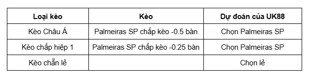 Tỷ lệ kèo hiệp 1: Palmeiras SP chấp kèo -0.25 bàn. Lựa chọn: Palmeiras SP.