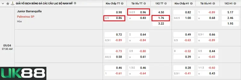 Kèo chấp của nhà cái UK88 đã đưa ra là chủ nhà Junior Barranquilla sẽ được hưởng kèo chấp bởi đội khách Palmeiras SP trong khoảng từ -0.25 đến -1.25 bàn. Dù Junior Barranquilla được chơi trên sân nhà Estadio Jaime Morón León nhưng lại có trình độ chơi bóng thấp hơn so với Palmeiras. Bên cạnh đó, Palmeiras SP có thành tích đối đầu áp đảo hoàn toàn so với Junior Barranquilla. Ở 2 lần hành quân gần nhất đến Estadio Jaime Morón León, Palmeiras SP đều dễ dàng ra về với những chiến thắng. Cùng với đó là phong độ thi đấu quá tốt của Palmeiras SP khiến cho chủ nhà Junior Barranquilla gặp rất nhiều khó khăn. Do đó, người chơi nên lựa chọn Palmeiras SP chấp kèo đối với chủ nhà Junior Barranquilla.