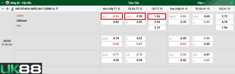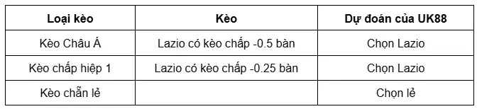 Kèo chấp của nhà cái UK88 đã đưa ra là chủ nhà Lazio sẽ có kèo chấp trước đội khách Udinese trong khoảng từ -0.25 đến -0.75 bàn. Lazio là đội bóng cửa trên và nhiệm vụ của họ sẽ là giành lấy được chiến thắng trước Udinese để thắng kèo Châu Á. Với đẳng cấp thi đấu cao hơn thì Lazio tỏ ra khá tự tin có thể làm được. Bên cạnh đó, Lazio đang có lợi thế thi đấu trên sân nhà Olimpico Stadium và được tiếp thêm sức mạnh từ người hâm mộ. Do đó, người chơi nên đặt cược vào cửa chủ nhà Lazio chấp kèo ở trận đấu tới đây.