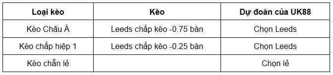 Nhìn qua tỷ lệ kèo đã đưa ra, nhà cái UK88 đánh giá hai đội bóng có sự chênh lệch nghiêng về phía chủ nhà Leeds. Bởi nhà cái UK88 đã đưa ra tỷ lệ ăn của Wolverhampton gấp hơn 3 lần so với của Leeds. Theo tính toán của siêu máy tính thì Leeds có xác suất thắng cao hơn với 60%, trong khi Wolverhampton có 17% và còn lại là 23% tỷ lệ hòa. Mọi thứ đang ủng hộ Leeds ở trận đấu này khi có lợi thế sân nhà Elland Road cùng phong độ thi đấu chói sáng. Bên cạnh đó, Leeds cũng vượt trội về thành tích đối đầu với Wolverhampton khi thắng 4 trong 5 trận gần nhất. Do đó, người chơi nên lựa chọn cửa thắng dành cho Leeds sẽ là kèo đấu dễ xảy ra ở trận đấu này.
