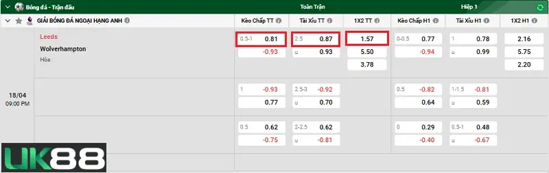 Kèo chấp của nhà cái UK88 đã đưa ra là chủ nhà Leeds sẽ có kèo chấp đối với đội khách Wolverhampton trong khoảng từ -0.5 đến -1.0 bàn. Với kèo chấp đưa ra, đội cửa trên là Leeds sẽ phải giành được chiến thắng trước Wolverhampton với cách biệt 1 bàn thì sẽ ăn kèo Châu Á. Leeds với lợi thế thi đấu trên sân nhà Elland Road cùng sự giúp sức của người hâm mộ, nên tỏ ra hết sức tự tin. Cùng với đó Leeds đang có phong độ thi đấu khá tốt và thành tích đối đầu vượt trội trước Wolverhampton khi thắng 4 trong 5 trận gần nhất. Do đó, người chơi nên cân nhắc lựa chọn cửa thắng cho Leeds.