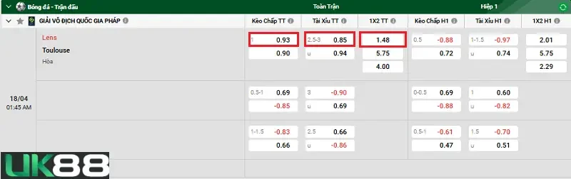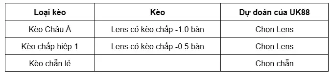 Kèo chấp của nhà cái UK88 đã đưa ra là Lens sẽ có kèo chấp đối với Toulouse trong khoảng từ -0.75 đến -1.25 bàn. Với kèo chấp được đưa ra, Lens sẽ cần có được ít nhất là một chiến thắng với cách biệt từ 1 đến 2 bàn trước Toulouse thì kèo trên thắng. Đây là điều không quá khó khăn đối với Lens bởi Toulouse lép vế về mọi mặt. Cộng thêm đó là lợi thế được thi đấu trên sân nhà Stade Bollaert-Delelis giúp cho Lens có sự tự tin cùng màn thể hiện tốt nhất. Do đó, người chơi có thể tin tưởng và đặt cược vào cửa Lens chấp kèo trước Toulouse.