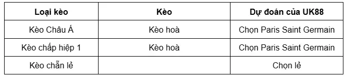 Tỷ lệ kèo châu Á: Liverpool có kèo hoà với Paris Saint Germain. Lựa chọn: Paris Saint Germain. Dự đoán tỉ số chung cuộc: Liverpool 2-3 Paris Saint Germain.