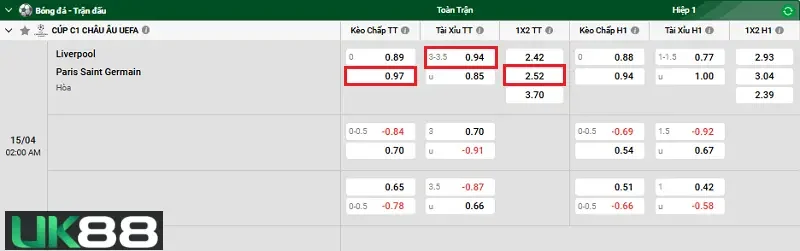 Tỷ lệ kèo hiệp 1: Liverpool có kèo hoà với Paris Saint Germain. Lựa chọn: Paris Saint Germain.