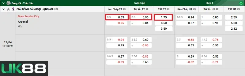 Kèo nhà cái Manchester City vs Arsenal hôm nay, 22h30 ngày 19/4/2026 (UK88)