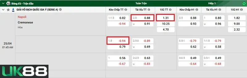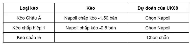 Kèo chấp của nhà cái UK88 đã đưa ra là chủ nhà Napoli sẽ chấp kèo với đội khách Cremonese trong khoảng từ -1.25 đến -1.75 bàn. Với kèo chấp khá cao, Napoli sẽ cần có được chiến thắng với cách biệt ít nhất là 2 bàn trước Cremonese để ăn mọi loại kèo Châu Á. Với sự chênh lệch lớn về thực lực giữa hai đội bóng thì Napoli đủ sức ăn được kèo đấu này trước Cremonese. Bên cạnh đó, Napoli còn được hưởng lợi thế to lớn khi thi đấu trên sân nhà Stadio Diego Armando Maradona. Cộng với đó là thành tích đối đầu vượt trội hơn của Napoli trước Cremonese trong quá khứ. Do đó, người chơi nên đặt cược vào kèo chấp của chủ nhà Napoli.