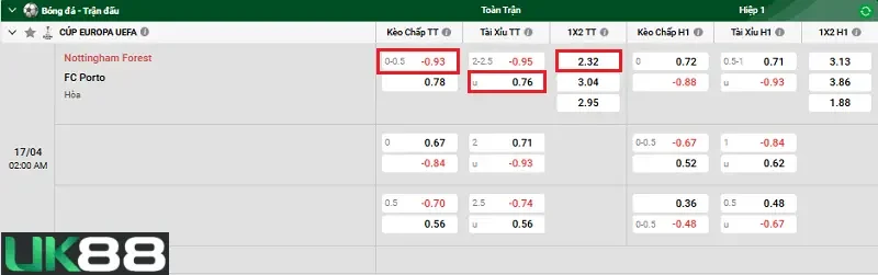 Tỷ lệ kèo hiệp 1: Nottingham Forest có kèo hoà với FC Porto. Lựa chọn: Nottingham Forest.