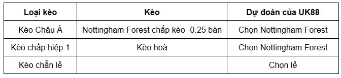 Kèo chấp của nhà cái UK88 đã đưa ra là chủ nhà Nottingham Forest sẽ có kèo chấp đối với đội khách FC Porto trong khoảng từ -0.25 đến -0.5 bàn. Nottingham Forest với lợi thế thi đấu trên sân nhà City Ground nên nắm được quyền chủ động trước FC Porto. Với kèo chấp đã có thì Nottingham Forest sẽ phải đánh bại được FC Porto thì mới ăn kèo Châu Á. Nottingham Forest sẽ có sự tự tin cao độ cùng quyết tâm chiến thắng khi có sự đồng hành của người hâm mộ. Cộng với đó, Nottingham Forest đã đánh bại FC Porto với tỷ số 2-0 trên sân nhà ở mùa giải năm nay tại vòng bảng. Do đó, người chơi nên lựa chọn Nottingham Forest chấp kèo đối với FC Porto.