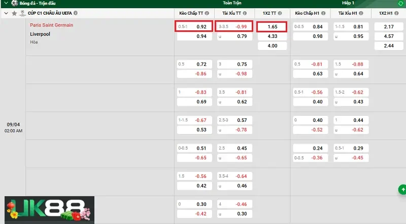 Kèo chấp của nhà cái UK88 đã đưa ra là chủ nhà Paris Saint Germain sẽ được hưởng kèo chấp từ đội khách Liverpool trong khoảng từ -0.25 đến -1.25 bàn. Paris Saint Germain với lợi thế thi đấu trên sân nhà Parc des Princes nên khả năng thắng kèo là rất cao. Với kèo chấp đưa ra thì Paris Saint Germain sẽ phải có được chiến thắng trước Liverpool với cách biệt 1 đến 2 bàn thì mới ăn kèo. Mọi thông số thống kê trước trận đấu đều nghiêng về phía chủ nhà Paris Saint Germain. Phong độ của hai đội bóng cũng trái ngược khi Paris Saint Germain với chuỗi thắng 4 liên tiếp thì Liverpool lại nhận những thất bại đáng quên. Do đó, người chơi nên lựa chọn Paris Saint Germain chấp kèo đối với Liverpool.