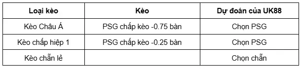 Tỷ lệ kèo châu Á: Paris Saint Germain chấp kèo -0.75 bàn. Lựa chọn: Paris Saint Germain. Dự đoán tỉ số chung cuộc: Paris Saint Germain 3-1 Liverpool.
