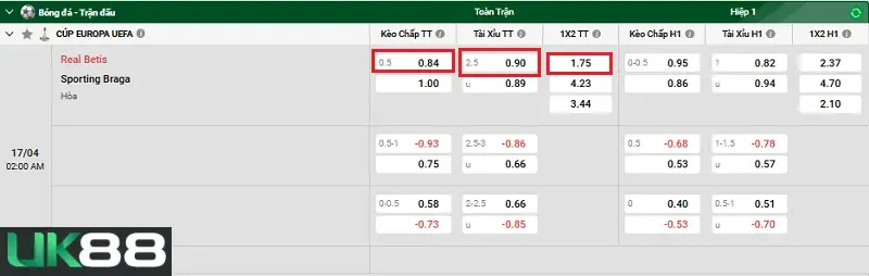 Kèo nhà cái Real Betis vs Sporting Braga hôm nay, 02h00 ngày 17/4/2026 (UK88)